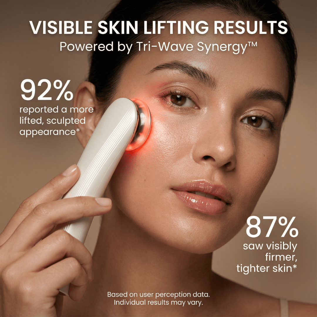 LumiLift Pro uses Tri-Wave Synergy™ - a powerful combination of microcurrent muscle stimulation, red light collagen activation, and sonic lymphatic drainage to target every layer of aging: